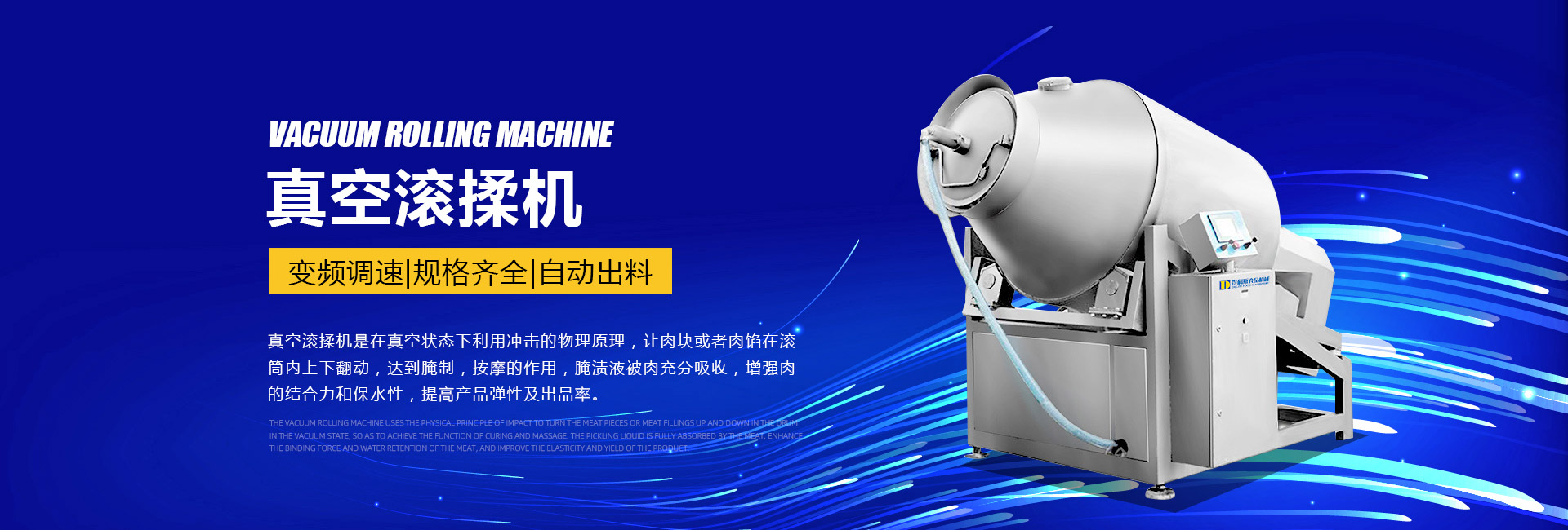 公司主要生產(chǎn)不銹鋼制品食品機(jī)械:各種規(guī)格型號(hào)真空滾揉機(jī)、制冷滾揉機(jī)、提升機(jī)、電加熱夾層鍋、肉丸機(jī)、真空攪拌機(jī)、絞肉機(jī)、灌腸機(jī)、打卡機(jī)、線扎機(jī)、斬拌機(jī)、鹽水注射機(jī)、煙熏爐、油炸機(jī)、巴氏殺菌線、連續(xù)油炸線、肉丸成型水煮線、醬鹵生產(chǎn)線、肉丸破碎機(jī)、真空包裝機(jī)、洗袋風(fēng)干機(jī)、豬頭劈半機(jī)、不銹鋼火腿模具、肉斗車、案桌、煙熏車、屠宰類機(jī)械設(shè)備、清洗風(fēng)干設(shè)備、肉類解凍設(shè)備、滾筒拌料機(jī)等。產(chǎn)品廣泛適用于火腿腸、肉丸、肉串、鹵制品、海產(chǎn)品、禽類深加工、油炸、泡椒風(fēng)味、速凍水餃、魚(yú)豆腐、千葉豆腐、豆腐干、牛肉干、牛排雞排類、禽蛋、麻辣、休閑、水果蔬菜清洗、中央廚房、餐飲連鎖、寵物食品等食品生產(chǎn)。
